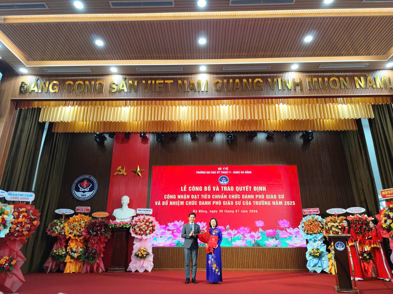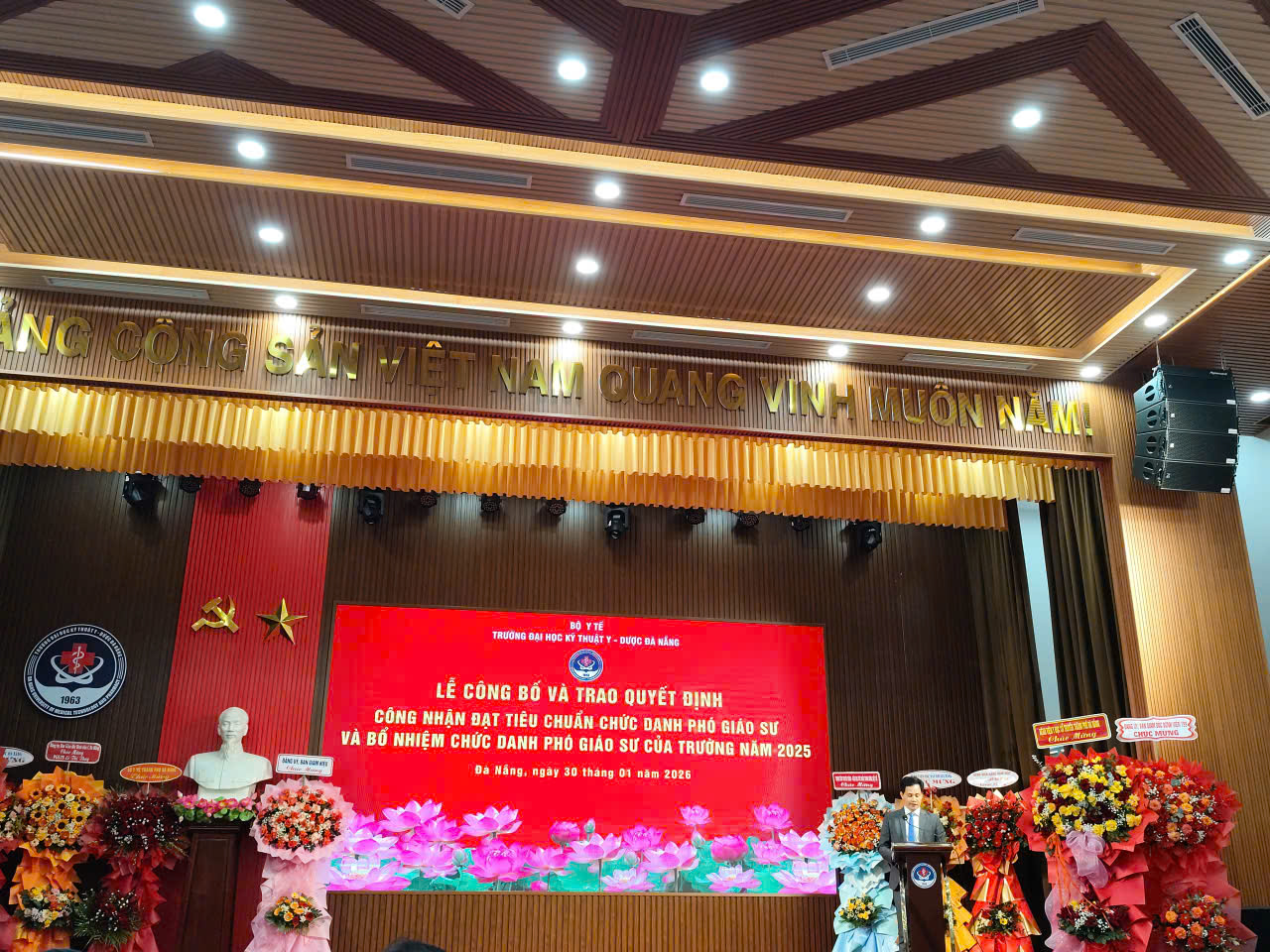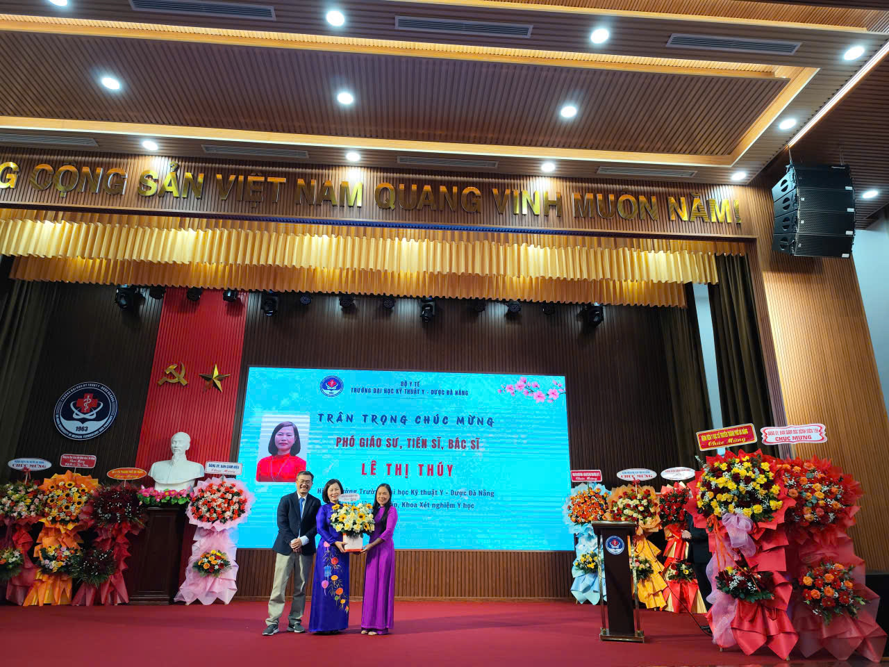 Chiều ngày 30 tháng 01 năm 2026, Trường Đại học Kỹ thuật – Y Dược Đà Nẵng đã long trọng tổ chức Lễ công bố và trao quyết định công nhận đạt tiêu chuẩn chức danh Phó Giáo sư và bổ nhiệm chức danh Phó Giáo sư của Trường năm 2025. Buổi lễ diễn ra trong không khí trang nghiêm với sự tham dự của Ban Giám hiệu Nhà trường, đại diện các đơn vị, khoa, phòng ban, cùng đông đảo cán bộ, giảng viên và khách mời. Đây là sự kiện có ý nghĩa quan trọng, ghi nhận những nỗ lực, đóng góp nổi bật của đội ngũ nhà giáo trong công tác giảng dạy, nghiên cứu khoa học và phát triển chuyên môn. Lễ công bố và trao quyết định công nhận đạt tiêu chuẩn chức danh Phó Giáo sư cho cô TS.BS Lê Thị Thúy là kết quả xứng đáng cho quá trình phấn đấu bền bỉ, tinh thần trách nhiệm và những đóng góp tích cực của cô trong sự nghiệp giáo dục – đào tạo và nghiên cứu khoa học của Nhà trường. Đồng thời trao quyết định bổ nhiệm PGS.TS.BS Lê Thị Thúy là giảng viên cao cấp thuộc Khoa Xét nghiệm Y học, trường Đại học Kỹ thuật Y - Dược Đà Nẵng. Phát biểu tại buổi lễ, đại diện lãnh đạo Trường Đại học Kỹ thuật – Y Dược Đà Nẵng đã chúc mừng tân PGS.TS.BS Lê Thị Thúy, đồng thời khẳng định việc công nhận và bổ nhiệm chức danh Phó Giáo sư không chỉ là niềm vinh dự của cá nhân nhà giáo mà còn là niềm tự hào chung của Nhà trường. Đây cũng là minh chứng cho định hướng phát triển đội ngũ giảng viên chất lượng cao, góp phần nâng cao uy tín và vị thế của Nhà trường trong hệ thống giáo dục đại học. Trong niềm xúc động, tân PGS.TS.BS Lê Thị Thúy đã bày tỏ lời cảm ơn sâu sắc tới lãnh đạo Nhà trường, các đồng nghiệp và gia đình đã luôn quan tâm, động viên, hỗ trợ. Đồng thời, cô cam kết sẽ tiếp tục nỗ lực cống hiến, phát huy vai trò, trách nhiệm của một Phó Giáo sư trong công tác giảng dạy, nghiên cứu khoa học và phục vụ cộng đồng. Buổi lễ khép lại trong không khí trang trọng, phấn khởi và tự hào, đánh dấu một dấu mốc quan trọng trong chặng đường phát triển đội ngũ giảng viên của Trường Đại học Kỹ thuật – Y Dược Đà Nẵng.