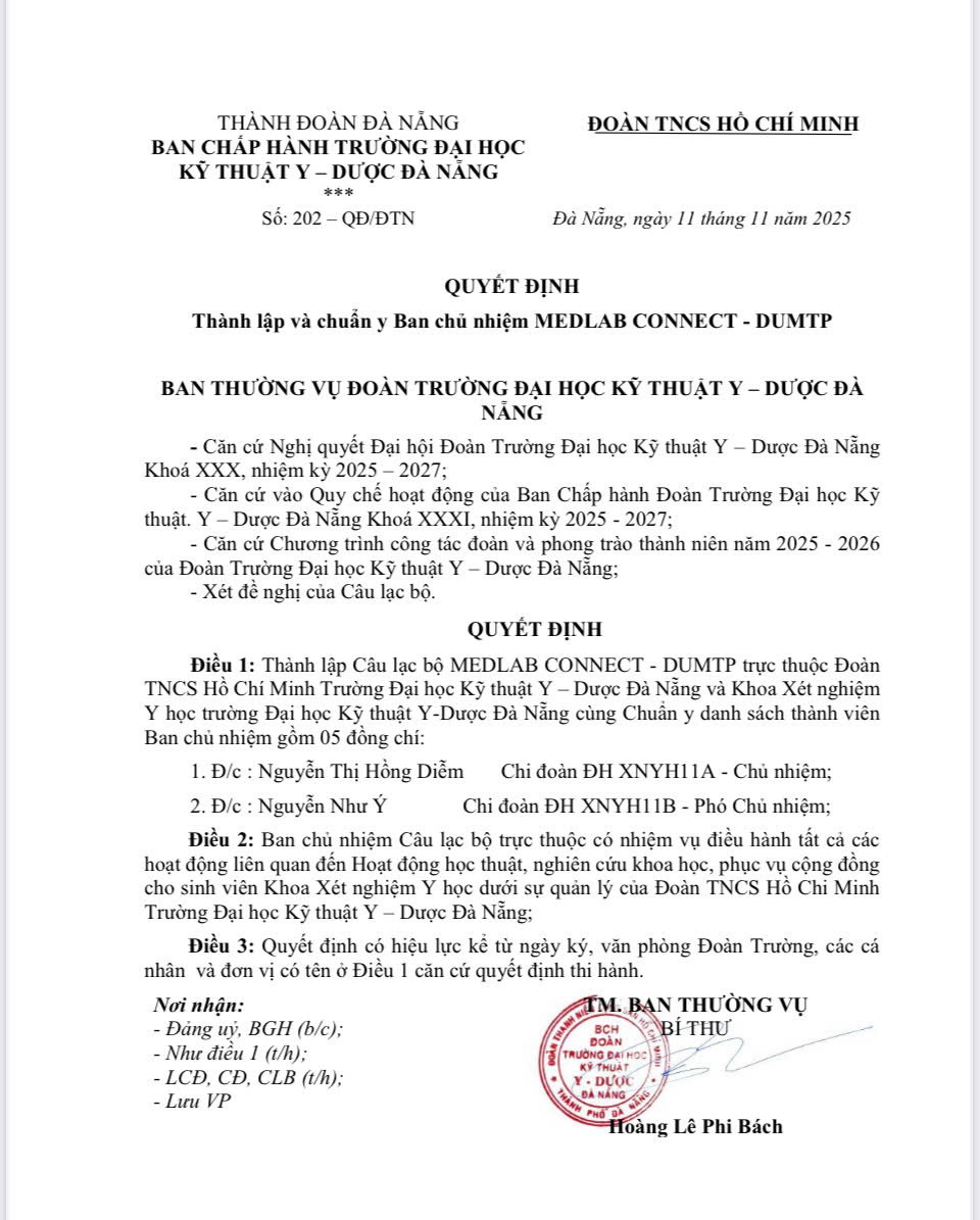 Câu lạc bộ MEDLAB CONNECT – trực thuộc Khoa Xét nghiệm Y học, Trường Đại học Kỹ thuật Y – Dược Đà Nẵng – đã chính thức được thành lập và đi vào hoạt động, hướng đến mục tiêu tạo dựng một môi trường học thuật năng động, gắn kết và hỗ trợ sự phát triển toàn diện cho sinh viên.