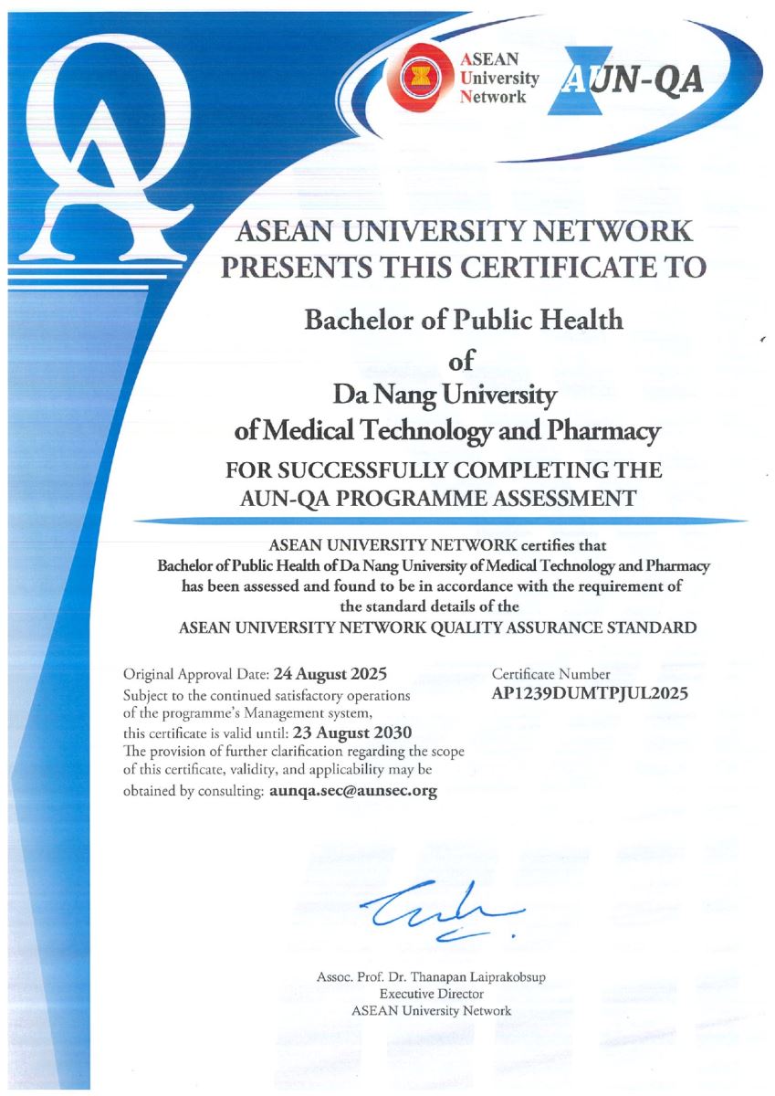 Mạng lưới các trường đại học ASEAN (ASEAN University Network - AUN) đã hoàn thành đánh giá ngoài theo tiêu chuẩn AUN-QA cho 2 chương trình đào tạo bậc đại học của Trường Đại học Kỹ thuật Y - Dược Đà Nẵng (cử nhân Điều dưỡng và cử nhân Y tế công cộng) cho kỳ đánh giá thứ 493 của AUN-QA (từ ngày 22/7/2025 đến 24/7/2025) và đã cấp giấy chứng nhận vào ngày 01/12/2025. Số GIẤY CHỨNG NHẬN: AP1238DUMTPJUL2025 cho CTĐT đại học ngành Điều dưỡng và AP1239DUMTPJUL2025 cho CTĐT đại học ngành Y tế công cộng.