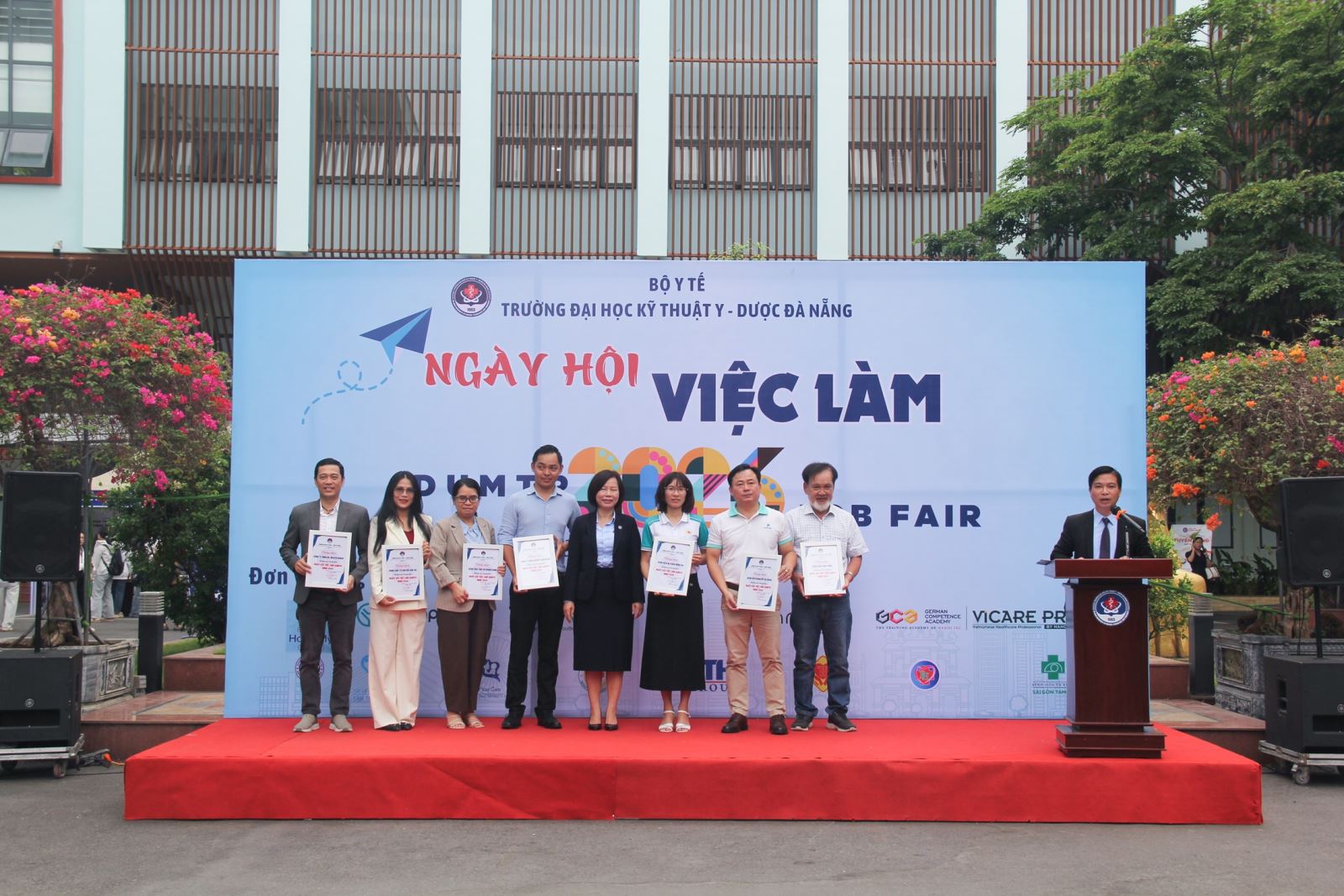 Sáng ngày 18/4/2026, tại Trường Đại học Kỹ thuật Y – Dược Đà Nẵng, Ngày hội việc làm DUMTP năm 2026 đã diễn ra sôi nổi với sự tham gia của 14 đơn vị (9 bệnh viện và 5 doanh nghiệp) uy tín cùng đông đảo cán bộ, giảng viên và sinh viên toàn trường. Đây là cầu nối quan trọng giữa Nhà trường và các đơn vị sử dụng lao động, góp phần mở rộng cơ hội việc làm cho sinh viên trong lĩnh vực y tế.