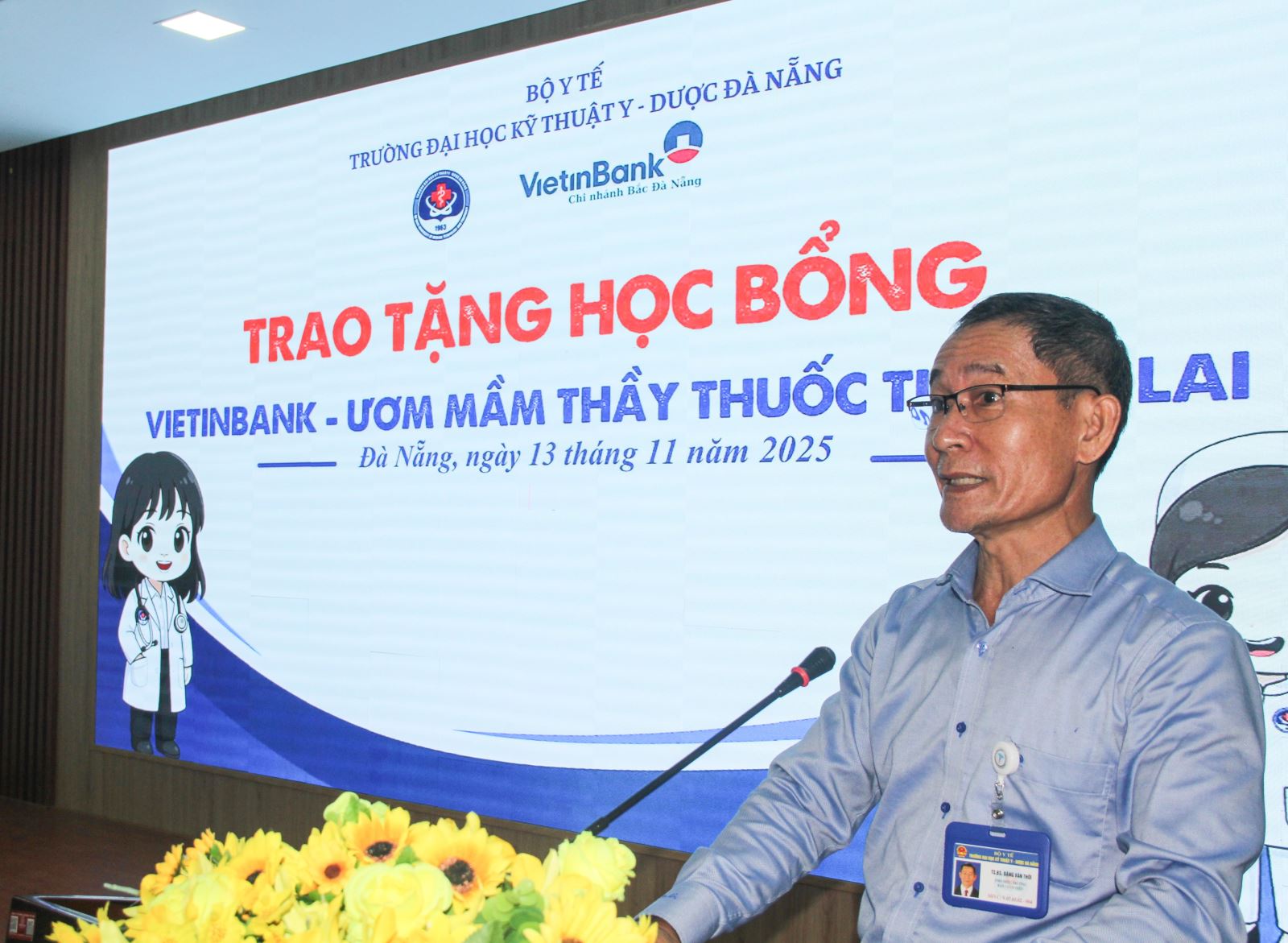 Phát biểu tại buổi lễ, TS.BS Đặng Văn Thởi - Phó Hiệu trưởng Nhà trường gửi lời cảm ơn đến Ngân hàng VietinBank - Chi nhánh Bắc Đà Nẵng đã đồng hành cùng Nhà trường thông qua chương trình học bổng ý nghĩa dành cho sinh viên. Khẳng định sự hỗ trợ của đơn vị tài trợ là nguồn động viên quan trọng, giúp các em thêm nghị lực vượt khó vươn lên trong học tập. TS.BS Đặng Văn Thởi chúc mừng 10 sinh viên được nhận học bổng và mong các em tiếp tục nỗ lực rèn luyện để trở thành những cán bộ y tế có năng lực và đạo đức.
