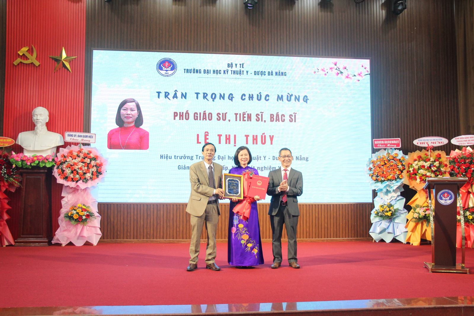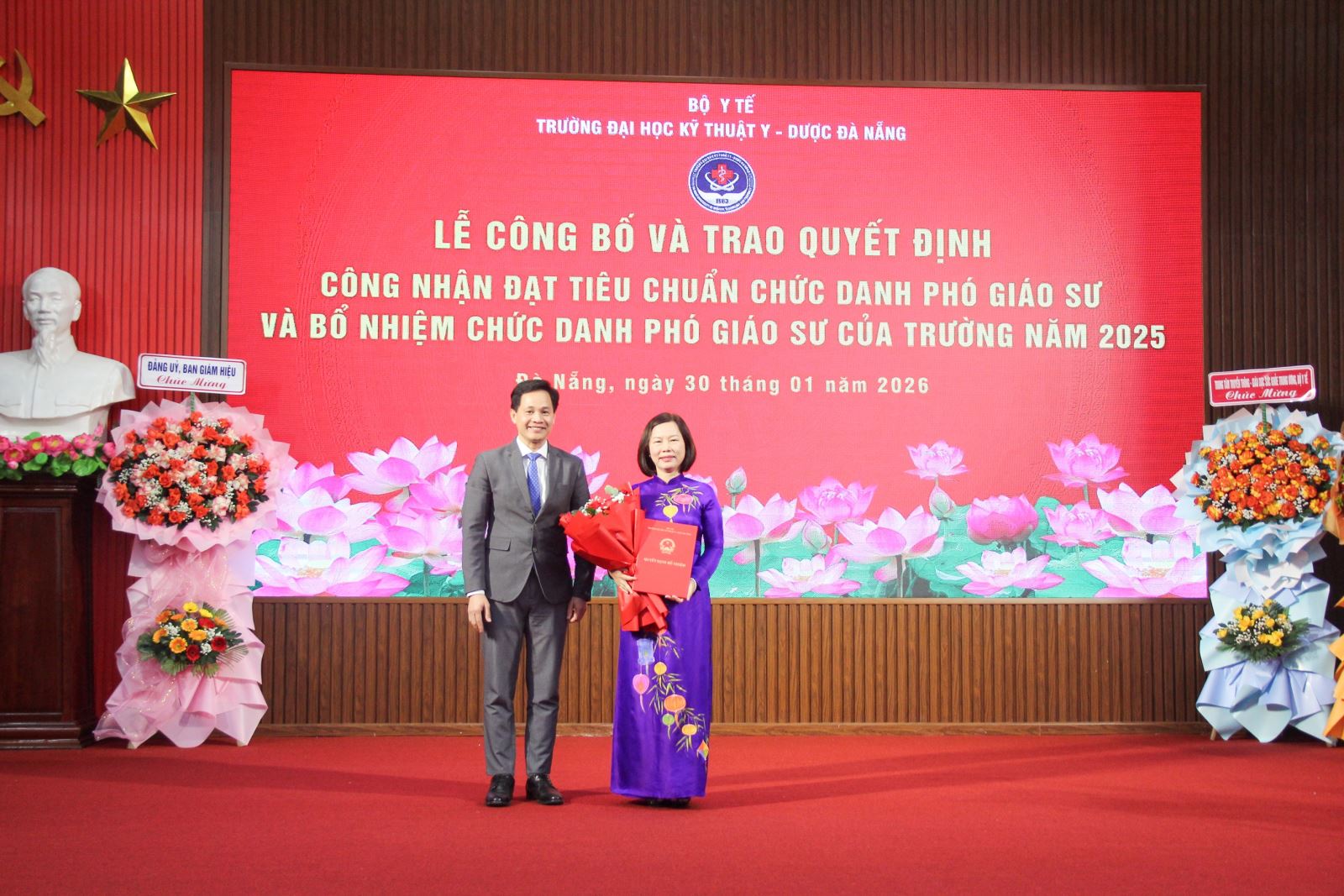Ngày 10/01/2026, Trường Đại học Kỹ thuật Y - Dược Đà Nẵng long trọng tổ chức Lễ công bố và trao quyết định công nhận đạt tiêu chuẩn chức danh Phó giáo sư năm 2025 và bổ nhiệm chức danh Phó giáo sư. Tham dự buổi lễ có GS.TS Phạm Minh Khuê - Phó Bí thư chuyên trách Đảng ủy Bộ Y tế; TS Vũ Mạnh Cường - Giám đốc Trung tâm Truyền thông Sức khỏe, Bộ Y tế; BSCKII Trần Thanh Thủy - Giám đốc Sở Y tế thành phố Đà Nẵng; lãnh đạo các bệnh viện cùng toàn thể viên chức, người lao động Nhà trường. Về phía Trường Đại học Kỹ thuật Y - Dược Đà Nẵng có TS.BS Lê Văn Nho - Bí thư Đảng ủy; PGS.TS Lê Thị Thúy - Phó Bí thư Đảng ủy, Hiệu trưởng; các Phó Hiệu trưởng và nguyên lãnh đạo Nhà trường qua các thời kỳ.