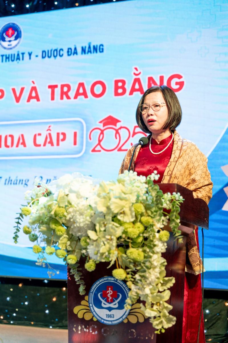 Phát biểu tại buổi lễ, PGS.TS Lê Thị Thúy - Hiệu trưởng Nhà trường chúc mừng các tân Chuyên khoa cấp I, đồng thời ghi nhận tinh thần nỗ lực, trách nhiệm và ý thức học tập nghiêm túc của học viên trong suốt quá trình đào tạo. Hiệu trưởng nhấn mạnh vai trò quan trọng của chương trình đào tạo Chuyên khoa I trong việc nâng cao năng lực chuyên môn, kỹ năng thực hành và y đức cho đội ngũ cán bộ y tế, góp phần đáp ứng yêu cầu ngày càng cao trong công tác chăm sóc, bảo vệ và nâng cao sức khỏe Nhân dân. Tại buổi lễ, PGS.TS Lê Thị Thúy đã trực tiếp trao bằng tốt nghiệp cho 100 tân Chuyên khoa cấp I ngành Điều dưỡng và Kỹ thuật Xét nghiệm y học, đánh dấu kết quả của quá trình học tập, rèn luyện và trưởng thành về chuyên môn của các học viên.